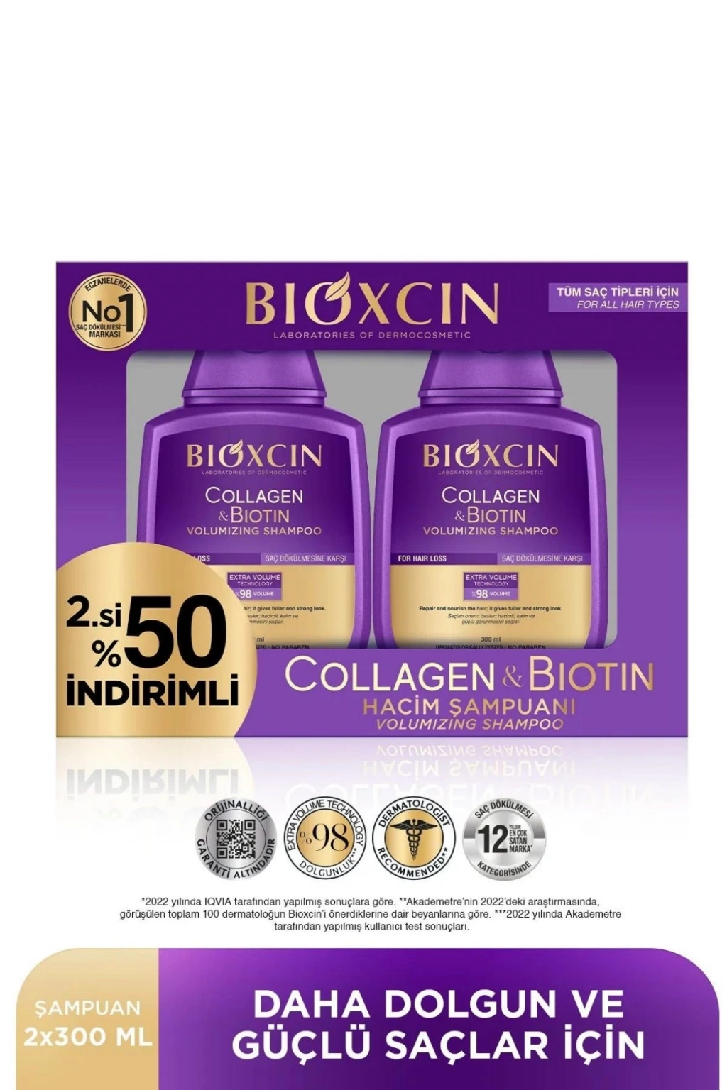 Kullanım Islak saça hafifçe masaj yaparak uygulanır, saçta 1-2 dakika beklettikten sonra iyice durulanır. Günlük kullanıma uygundur. Klinik Çalışmalar Akademetrenin 2021 yılındaki kör ürün testinde 150 kişinin değerlendirmelerine göre Bioxcin Collagen&Biotin Hacim Şampuanı’nın saçı, İlk yıkamadan itibaren %97,3 oranında saçı güçlendirdiği