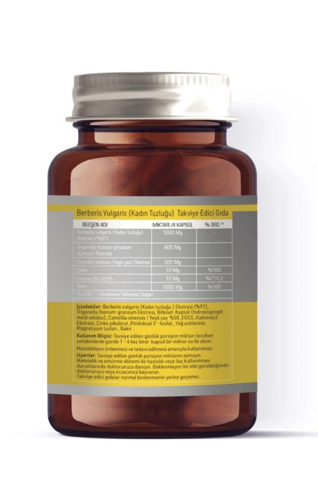 Goodday Berberina 60 Kapsülİçindekiler: Berberis vulgaris (Kadın tuzluğu) Ekstresi, Trigonella foenum-graceum Ekstresi, Bitkisel Kapsül (Hidroksipropil metil selüloz), Camellia sinensis (Yeşil çay) Ekstresi, Çinko pikolinat , Piridoksal 5ꞌ -fosfat , Yağ asitlerinin Magnezyum tuzları , Bakır Sülfat .