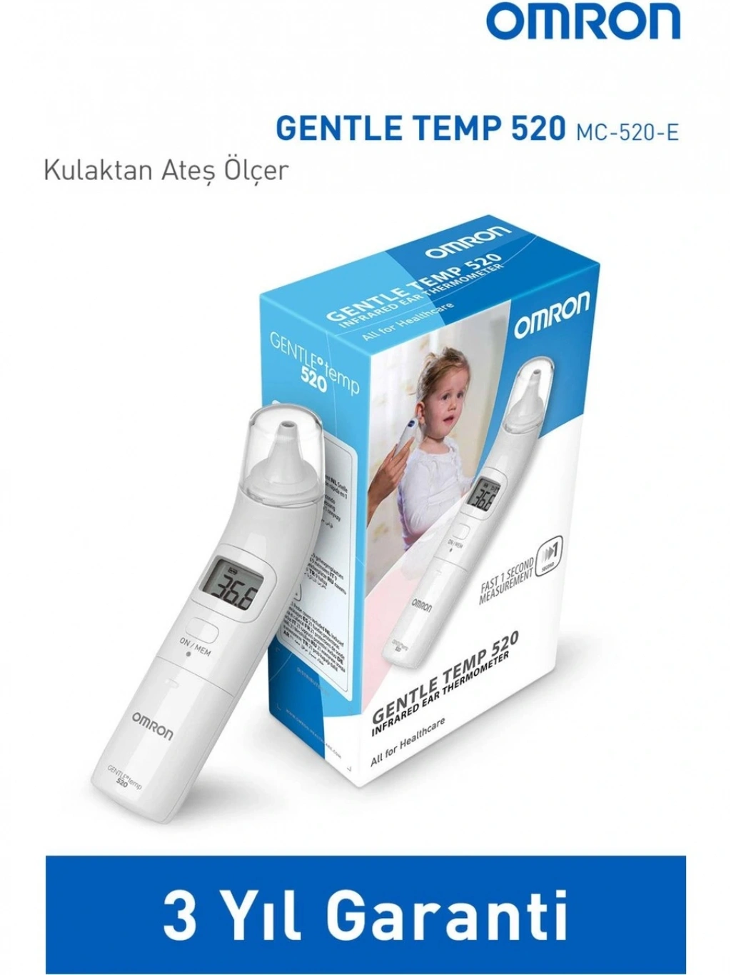 Omron Gentle Temp 520 Kulaktan Ateş Ölçer1 saniyelik hassas ölçüm Gentle Temp 520 kulaktan ateş ölçer Gentle Temp 521 ile aynı yüksek hassasiyetli teknolojiyi kullanır ve bazı gelişmiş özelliklerinin yanı sıra belirli bir süre boyunca sıcaklık değişikliklerini izlemek ve eğilimleri izlemek için dokuz okumaya kadar hafıza içerir. * 3'ü 1 arada: kulak içi ölçüme ek olarak oda ve yüzey (örn. süt şişesi) sıcaklığını ölçer. * Hafıza: 9 ölçümlük hafıza * Sesli uyarı sinyali: var * Otomatik kapanma: var * Değiştirilebilir pil: var * ˚C/˚F Seçimi: var